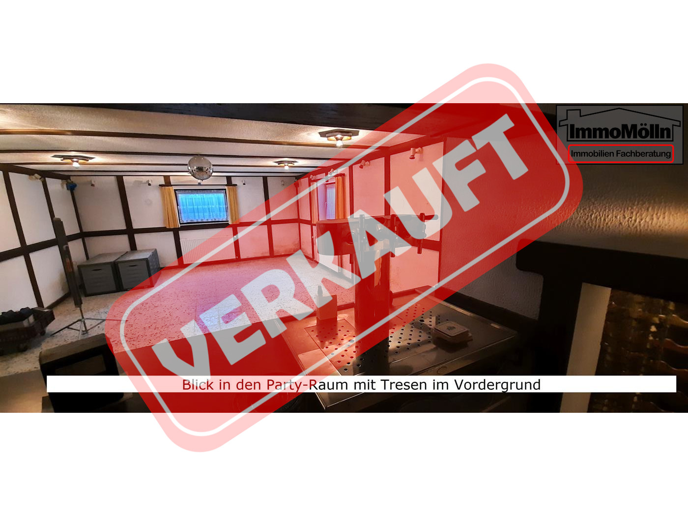 Gleich rechts geht es in den großzügig ausgelegten Party-Raum (ca. 42,8m²) in dem sich auch der Bar-Tresen mit der Bierzapfanlage befindet. Eine drehende Spiegelkugel sorgt hier für Disco-Feeling. Ein aufwändiges Weinregal findet seinen Platz unter der Kellertreppe direkt neben der Bar.