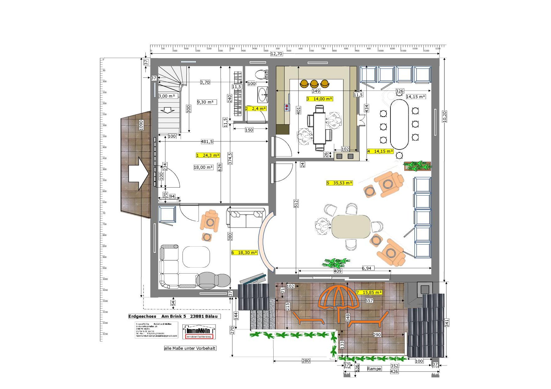 Der Wohnbereich im EG gliedert sich in 3 Abschnitte: Stube, Wohnzimmer und Esszimmer und gehen offen gestaltet ohne Türen ineinander über. Alle 3 Zimmer sind an der Decke weiß und haben einen Laminat-Fußboden im Esche-Design.